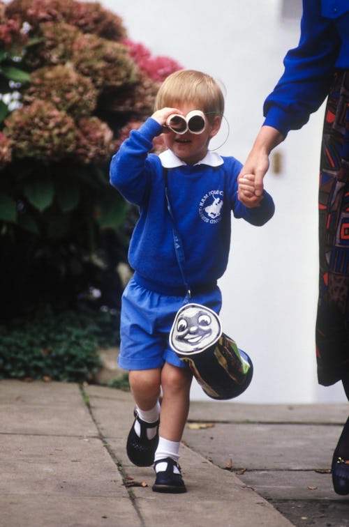 Prince Harry went more casual and looked like he was carrying his own mat, hopefully for napping, on his way to Mrs. Mynors's Nursery School in 1987.