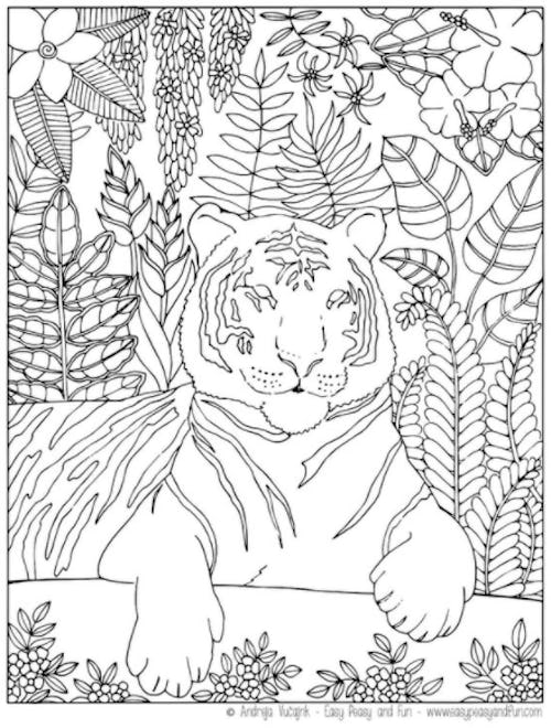 Kids aren’t the only ones who love coloring animals. This one-off page features a beautiful tiger in the jungle. But rather than sharp lines, his face is a bit more open to interpretation for those coloring fans looking for a bit more of a challenge.