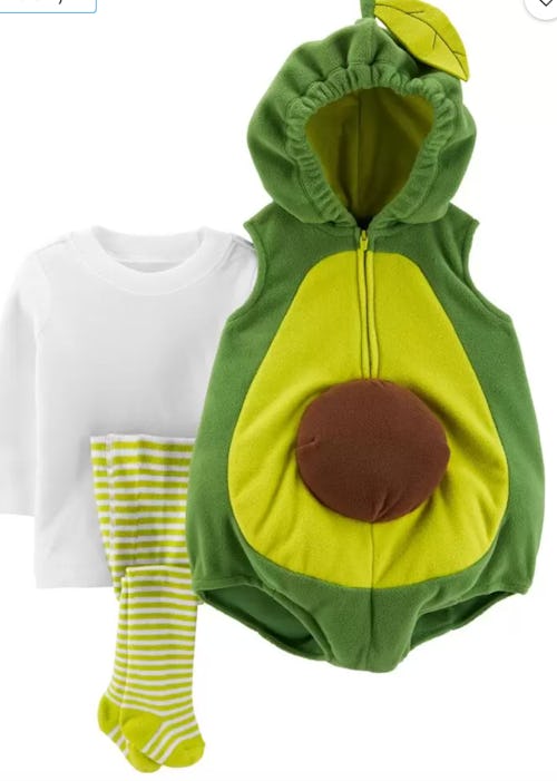 Do you often call your baby delicious? Dress your 12-to-24-month-old in this soft, polyester microfleece. With a hood topped with a stem, and a pit fashioned over baby’s midsection, it’s bound to elicit more than a few “Awws” and “Yums” throughout the night. And the green-and-white-striped socks will help keep baby warm.