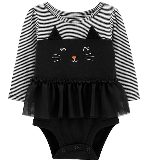 Pair the trendy body suit — printed with cat ears, eyes and whiskers — with black tights and in two minutes you have a costume fit for newborn and 24-month-old babies.