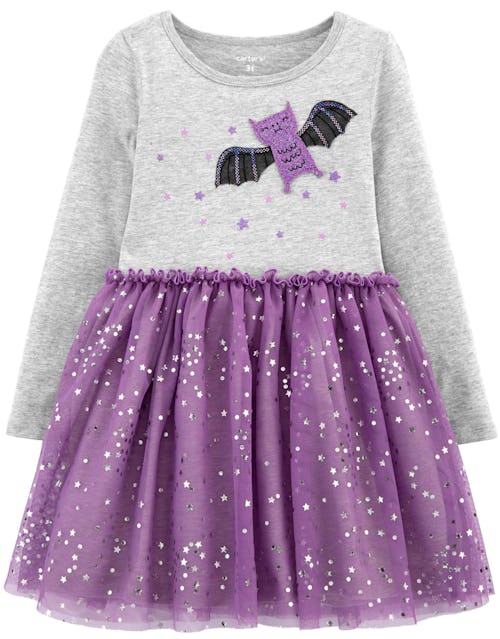 The long-sleeve one-piece dress (in sizes 2T to 5T) has a photo of a bat on its top, and a smattering of metallic stars all over its tutu bottom. You can add a sparkling wand or bat wings for a festive or more realistic spin.