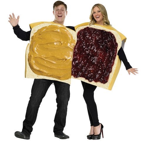 According to the description, “The Peanut Butter and Jelly couple costume is unisex size and fits up to 6' and 200 pounds, and up to 16W in women's.”