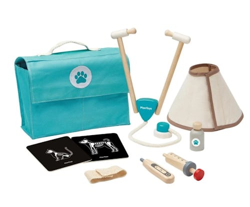 Young kids who love animals can pretend to check them out, bandage them up, and treat their illnesses with this super cute eight-piece toy vet set. It comes with a thermometer, a stethoscope, a little vial of medicine, a syringe, a bandage, a cat x-ray image, a dog x-ray image, a little cone (to keep animals from licking their wounds), and a little doctor bag to carry everything in. The set is absolutely adorable, and each piece is made from high quality wood and/or fabric materials that are easy to wipe clean with a towel and some soapy water.