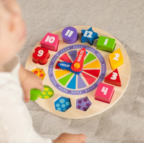 This clock lets kids practice their numbers, identify shapes and colors, start learning how a clock works, and it also serves as a puzzle. There are 12 pieces, one for each hour on a clock, all of which are differently designed, and the clock’s minute and hour hands actually move around so kids can practice telling time.