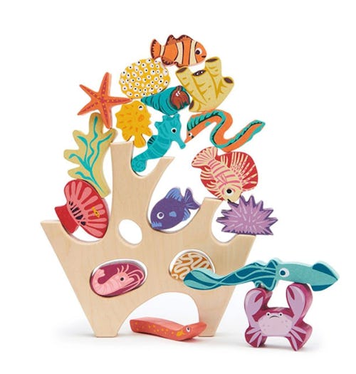 This toy is fantastic because it allows kids to explore stacking and balancing and there isn’t just one single way to play with it. The set comes with one large piece of “coral” as well as 18 smaller stacking pieces including a shrimp, hermit crab, a squid, a starfish, four coral pieces, two eels, a crab, a sea anemone, a seahorse, and a sea urchin. Each part of the toy is made from high-quality wood that’s easy to wipe clean with a towel and some soapy water. This set is really great for kids who seem to have a natural interest in building and engineering, but it can be easily enjoyed by just about anyone.