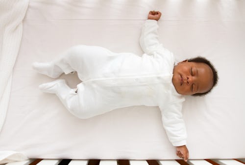 As for ensuring your baby is safe, make sure that whatever pajamas you choose, whether it’s footies, separate pieces, or a romper of some sort, have a snug fit. This shouldn’t be too difficult, as baby pajamas should be made to fit snug anyway, but you will need to make sure you’re getting the correct size for your baby (just because they’re a newborn doesn’t mean newborn sizing is right for them). Additionally, “embellishments and fasteners that can come loose, such as buttons or pacifier clips, should never be used in a sleep space,” says Crockett. As for swaddles, caregivers should know how to swaddle correctly to ensure safety. Crockett explains that a proper swaddle will “allow for movement without excess material gathering around the face.” Finally, it’s important to know when to stop swaddling, too. “Babies should not be swaddled past four months [old],” pediatrician Dyan Hes, MD, tells Romper in an email, “because this can delay the milestones of rolling over.”