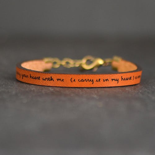 This leather bracelet features a line from the famous E.E. Cummings poem, “I Carry Your Heart.” The words, I carry your heart with me (I carry it in mind heart) are burned onto the leather bracelet, so they will not fade over time.