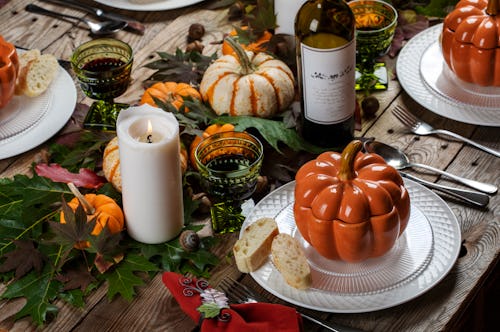 The first thing you can think about when planning a Thanksgiving tablescape is how much room you actually have at the table. So lay out your placemats and chairs, and set out your empty serving trays a few days before Thanksgiving so you can see how much space you have for decorations. Then think about a color scheme. You can play off of the color of your walls, your dishes, or the food; you can choose to go with a monochromatic look or mix-and-match tones that have the same vibe. From there, you can start to incorporate your dishes, cutlery, and decorations. These ideas are meant to inspire your creativity, and spark a tablescape and design all your own.