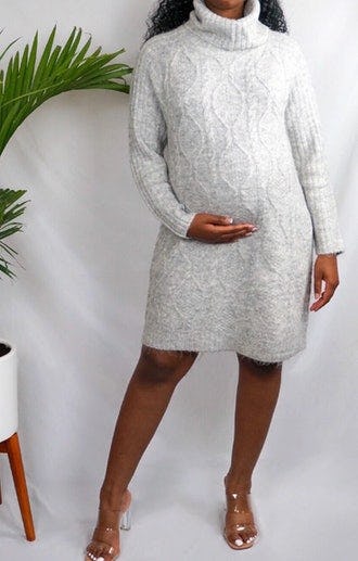 For the cold winter months, just throw this sweater dress on over some tights (or your leggings, I’m not here to judge) for a warm, comfortable office look. The dress has a cable knit design on the front, features a turtle neckline, and falls around knee-length. The fabric is lightweight and offers some stretch, so between that and the overall relaxed fit, it’s something that you can wear throughout pregnancy and beyond. However, like most sweaters, you will need to wash this dress by hand and hang dry it to ensure it doesn’t shrink (especially since that would defeat the entire purpose of a maternity piece).
