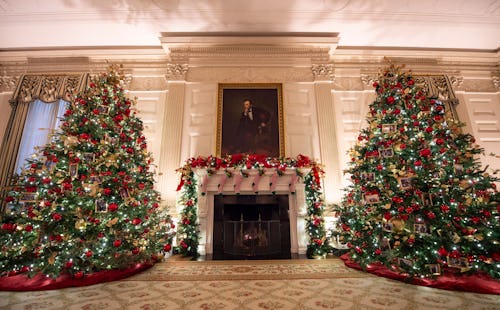 Each room in the White House has been decorated to reflect and celebrate one of the gifts. In the State Dining Room, for example, two towering Christmas trees have been adorned with photographs of past and present first families to celebrate the “Gift of Family” and honor the families who have made the White House a home. To further the room’s theme of family, red-white-and-green striped stockings embroidered with the names of Biden’s grandchildren have been hung on the mantle under a portrait of President Abraham Lincoln that was painted by George Peter Alexander Healy in 1869.