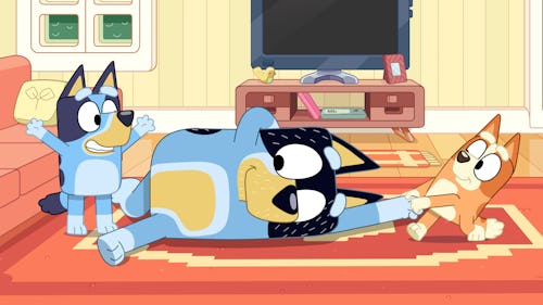 In the next, Bandit is lying on the floor on his side, while Bingo pulls at his arm and Bluey seems to cheer her on from his feet. It looks like a fun new game that kids are definitely going to want to play with their parents!