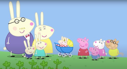 Kids can get a feel for pregnancy in Peppa Pig Season 4, Episode 10, “Mummy Rabbit’s Bump.” Mummy Rabbit has a big tummy and lets Peppa listen to it, telling her she’s pregnant. She has gross-sounding cravings that make the kids laugh. Afterward, they go to the hospital and Mummy Rabbit has twins, Robbie and Rosie, making her older bunnies, Rebecca and Richard, big siblings. As this is her third pregnancy and delivery, the babies were born so fast that Daddy Rabbit missed it, which is funny because she assured him “having a baby always takes a long time.” Another helpful episode is Season 2, Episode 31, “The Baby Piggy.” In it, Peppa and George get to meet cousin Chloe and her new baby brother Alexander.
