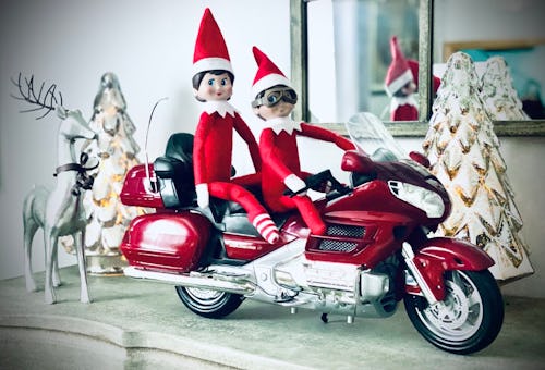 These elves are ready for a Christmas roadtrip riding off into the sunset. If you don’t already have a miniature motorcycle (Barbie has an iconic pink Vespa), you can purchase this affordable red stunner on Amazon. To really commit to the gimmick, send your Elf and the motorcycle down your driveway or a sidewalk on a hill and record the magic.