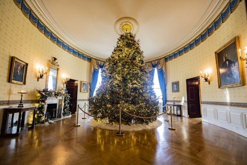 Each room is a variation of the overarching theme. The Library, for example, celebrates how stories bring the American people closer together, and face to face with our history. The East Room highlights national treasures, including representation of every National Park. The Blue Room houses the official White House Christmas tree, the centerpiece of the enormous decorating project; this year, it is adorned with ornaments depicting the official birds of all states and territories, and Washington, D.C. Dr. Biden described the 18-foot tall evergreen as “a stunning symbol of unity.”