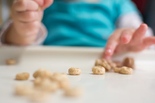 “I’m putting an ‘O’ cereal on their tray when I’m seeing them pick up things with two fingers,” explains Dr. Natasha Burgert, a pediatrician and American Academy of Pediatrics spokesperson. A true “pincer grasp” means that Baby is using just the tips of their fingers to pick food up, which most kids can't do by 9 months, she explains. However, they don’t have to have mastered that skill to be able to eat ‘O’ cereal. If they can pick up a food with two fingers — using what Burgert calls an “incomplete pincer” — they’re ready for ‘O’ cereals. Typically, this happens around 9 months of age, she adds, though every baby will develop at a slightly different pace and it’s always a great idea to check in with your pediatrician.