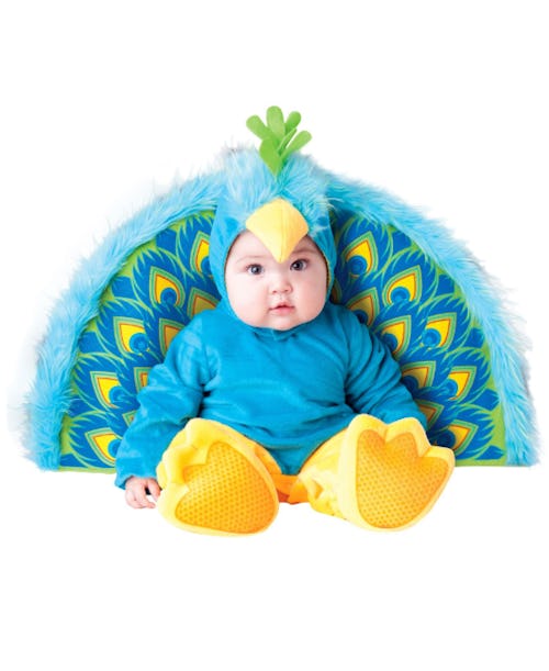 The precious peacock costume includes a jumpsuit, tail, hood (with attached beak), and booties shaped like bird feet. Take the cuteness factor right over the top by dressing your baby and dog in matching peacock costumes for Halloween.