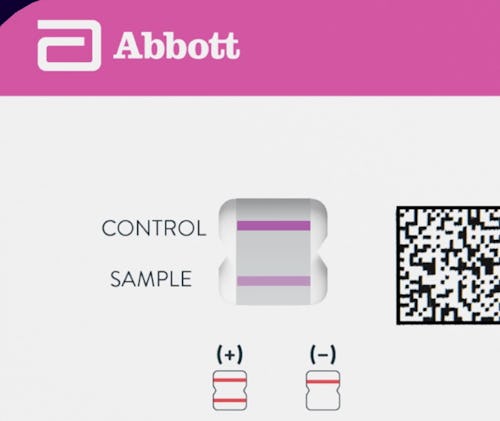 The BinaxNow Covid-19 Antigen Self-Test comes with a swab and a testing solution. Unlike a lot of other at-home Covid tests, this one has a fold-over card that’s used for testing. After swabbing the nose, you’ll put a few drops of the solution into a little hole, then insert your swab into the hole, twist it around a few times, and wait 15 minutes for results. As you can see in this photo, you’ll read your results in a little window with a test strip with a control line and a sample line. The sample line’s darkness may vary, but even a faint line should be considered positive.