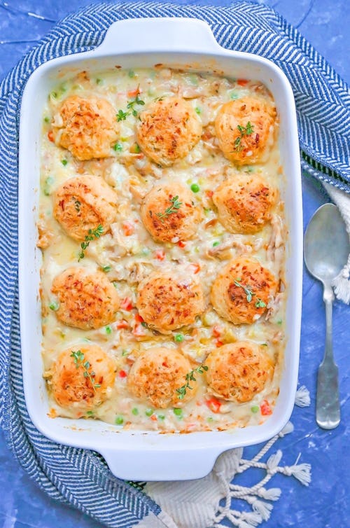 This is the meal a new mom wants to come home to: chicken pot pie with cheddar chive biscuits. So savory, so cozy, the ultimate stick-to-your-ribs dinner that will make her feel loved and cared for. (And will also feed her whole family.)