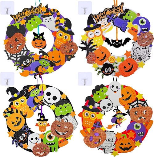 This Halloween wreath kit is perfect if you need a craft kit for several kiddos. It comes in a pack of 12 with tons of decorations and even hanging hooks, so this works out really well for a party craft or a crowd of people. I especially love the hanging decoration in the center of each wreath, and the little characters are so bright and fun.