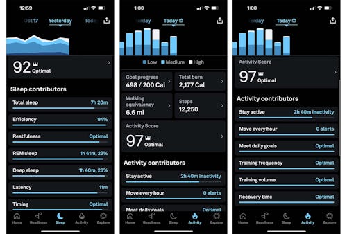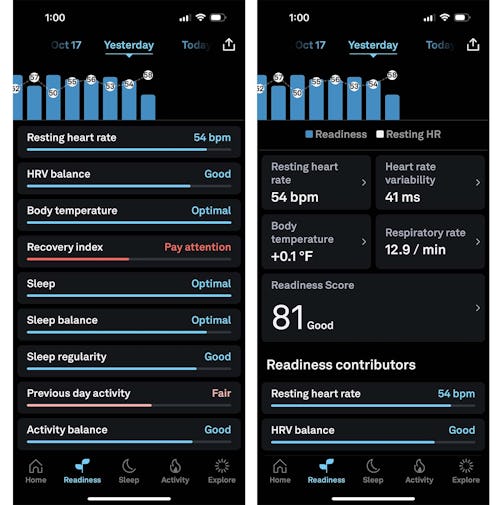 The Activity screen will show you information about your daily movement (steps, calories burned, etc.). The Readiness tab is a distillation of your sleep and activity levels, as well as a few other factors, including your resting heart rate, body temperature, and Heart Rate Variability (HRV). Low HRV can be a sign of serious health problems, or just that you are stressed or recovering from something. It can also be a physical measure of emotional distress, which I have found fascinating.