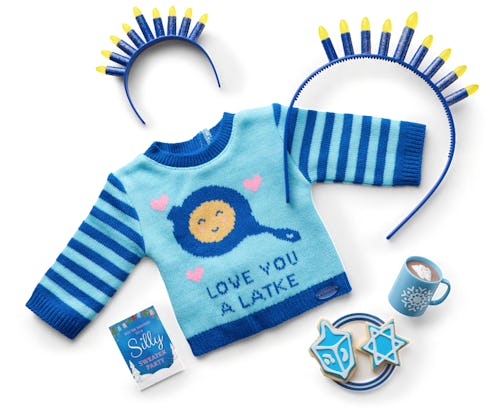 This is the perfect way to outfit your little’s little (aka an 18-inch doll) in festive attire that’s sure to be a hit at any silly sweater party. The set, for children ages 6 and up to play with, includes an “I Love You a Latke” doll sweater, party invitation, make-believe Star of David sugar cookie, and matching doll-and-child menorah headbands. This pretend party is sure to be lit!