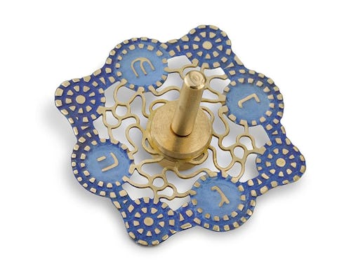 Handcrafted and hand painted by Israeli artist Orit Grader, this blue-toned brass mosaic dreidel is a work of art that will easily be passed from generation to generation. Both playable and pretty, this dreidel includes the traditional Hebrew letters that spell out “a great miracle happened there.”