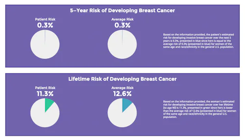 The National Cancer Institute website has a free, online breast cancer risk assessment calculator available for anyone to use. You simply fill out the questionnaire to the best of your ability, and the tool will give you two percentages: your risk of developing invasive breast cancer in the next five years, and your risk of developing it in your lifetime. Your personal percentages will appear on the left, with the average risk of women of the same age and race or ethnicity in the general U.S. population presented on the right for comparison.