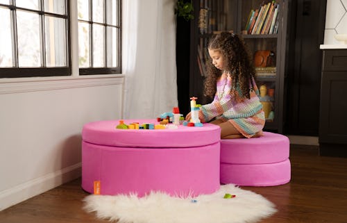 The Chunk is made up of four pieces: one outer circle cushion with an open center, two smaller circles that nestle within it, and one large circle cushion that sits like a lid atop the other three. Currently it comes in 10 colorways to match any decor or the Nugget couch you already have. It measures 32 inches across and 15 inches tall, so compared to the Nugget couch (which is 66 inches long), it’s a more compact play furniture option. And like its couch cousin, you can build so many things with the Chunk, from tables to chairs to hopscotch courses and beyond.