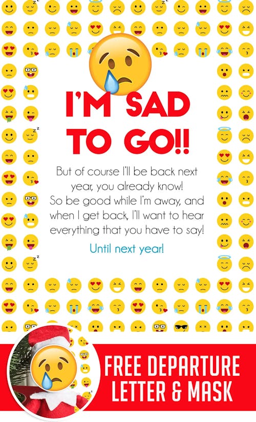 For older kids who are into emojis, they’ll love this Elf on the Shelf goodbye letter that is strictly *crying face*. Many other emojis are represented in this letter (like kissy face, surprise, happiness, snoozing, and, everyone’s favorite emotion — meh. But this one is cute because it captures exactly how the elf feels about leaving your kid. It also reinforces the idea that they’ll be back, (i.e. “But of course I’ll be back next year, you already know!”), and this sentiment is something that younger sibs might find reassuring. Until then, it’ll be *frowny face* until it’s time to welcome your elf back home again.