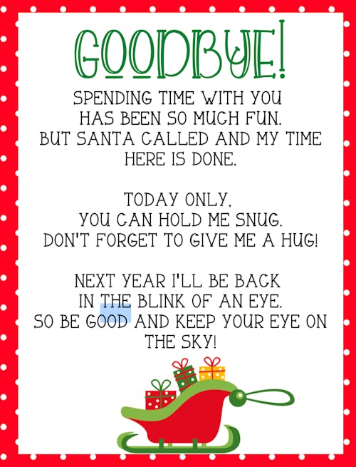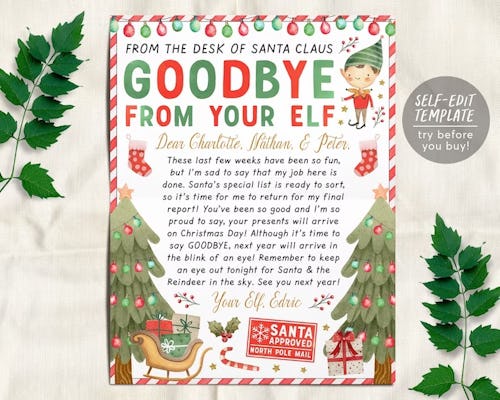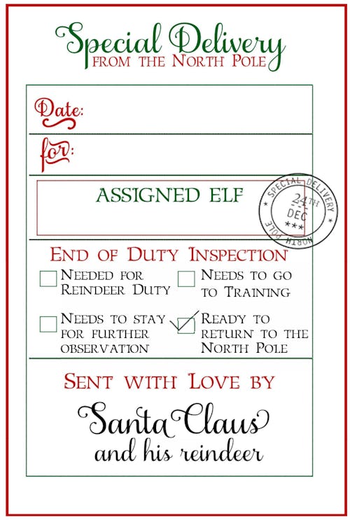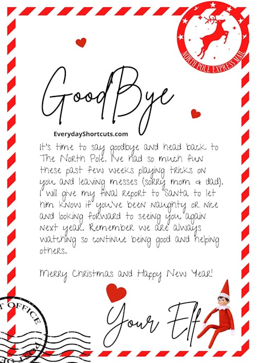 No matter how hard you tried, it seemed like you were scrambling every single day to come up with cute ideas for your Elf on the Shelf. So it’s no surprise then that, even on the last day, you need a fast and easy Elf on the Shelf goodbye letter. Enter this elf-tastic one from Mom Envy, which only requires you to print it out, fill in the date, your kid’s name, and put a check mark next to the “Ready to return to the North Pole” option. It even has a stamp so that your child will know that this letter came special delivery straight from the North Pole.