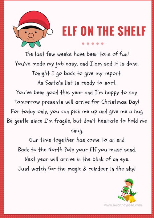 After weeks of engaging in all things Elf on the Shelf, you’re tired. And done. That’s why this easy goodbye letter from I Think We Could Be Friends is a sweet one — literally. Just make sure that you have extra ink for this colorful goodbye letter. It would probably look pretty on glossy photo paper, which would make the colors pop even more. And perhaps your child won’t mind their elf’s exit if there are, ahem, some doughnuts sitting on a plate alongside this letter for them to munch on, too.