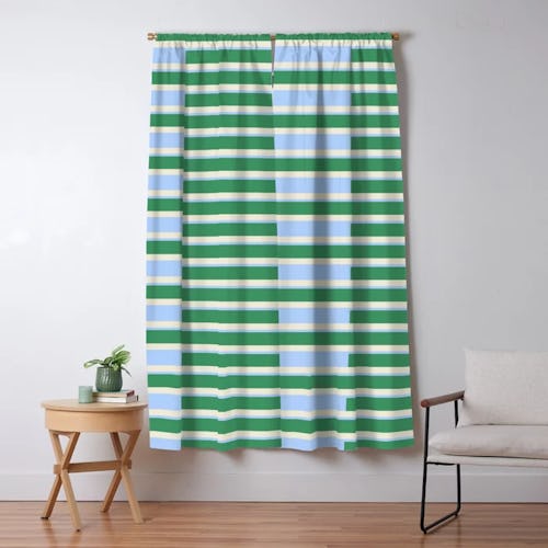 Another simple upgrade that can instantly change the feel of a room is to add curtains with an abstract pattern or unexpected pop of color. A solid choice is this dreamy abstract hand-drawn floral motif or this bright, clean striped design (and yes, rest assured they’re blackout curtains — every tired parent’s best friend).