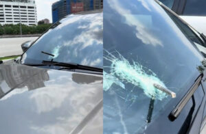 TikTok user @/cydaismail2 posted a video showing how an iron rod nearly pierced the windshield of a Proton X50 while she and her husband were driving along the Besraya Highway. The couple had just passed under a flyover when something suddenly fell and shattered the windscreen. Although shaken, the husband managed to stay calm and safely pulled the car over to the side of the road.